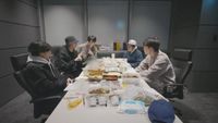 ソジュンお手製の豪華なステーキディナーを食べた後、リビングでアルカギ(碁石を使ったおはじきのようなもの)対決。負けたらデコピンの罰ゲームを賭けて真剣な戦いが続き、負けたPeakboyにVがデコピン…と思ったら、ソジュンの入れ知恵で急遽おでこをビンタ。目を閉じていたPeakboyは予想外の仕打ちに倒れ込むほど驚き、彼のリアクションに転がって爆笑するソジュンとV。一緒にいれば、ささいなことでも楽しくてしかたない。そんなリラックスした雰囲気が微笑ましい。