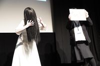 貞子とギャル代表が顔をそろえた貴重な機会となり、ステージではギャルのバイブスと、貞子の呪いのパワー、どちらが強いのかを判断すべく、“知力、眼力、運”のお題で、3本勝負を行うことに。まず第一ラウンドでは“知力”勝負として、ギャル用語対決に挑んだ登壇者陣。