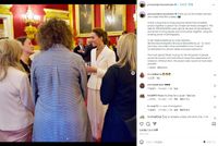 また、注目は戦没者を追悼する赤いポピーのブローチが映える、黒の装い。セルフポートレートの、かっちりとしたジャケットに、裾がレースのエレガントなスカートが絶妙なバランスのツーピースの装いは、昨年9月、当時のキャサリン妃が、「Hold Still」のプロジェクトでレセプションのホストを務めた際に着ていた白いツーピースの色違いで、お気に入りの1点と言えそう。
