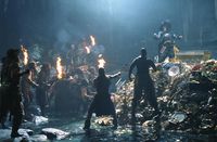 映画シリーズにはこのアトラクションを再現したシーンも登場。第1作『~呪われた海賊たち』のキーとなる“アステカの金貨”には、1枚でも盗んだ者に対して不死身の身体になる代わりにいくら酒を飲んでも酔えず、食べ物は舌の上で灰になってしまうという生きる楽しみをすべて奪ってしまう呪いがかけられている。アトラクション内にも山のように積まれた金貨の上で立ち尽くす骸骨になった海賊の姿が確認でき、映画のアイデアになったと考えられる。また、ポート・ロイヤルで海軍に捕まった主人公のジャック・スパロウ(ジョニー・デップ)ら海賊たちが牢屋の格子の間から骨を出して、鍵束を咥えたイヌを呼ぶシーンがあるが、こちらも似た場面がアトラクションに登場する。