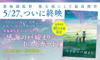 このたび決定した“最後の戸締まり上映”では、今後発表される予定のBlu-ray&DVDのためにブラッシュアップされた本編が各映画館で上映。全273カットが細部までリテイクされた特別版として、映画館の大スクリーンで先行体験できる非常に貴重な機会となっている。また入場者プレゼントとして、映画公開後に発表された「おかえりなさいビジュアル」がデザインされ、裏面に新海監督からのメッセージが付いた「感謝の戸締まりポストカード」が全国40万名様限定で配布されることが決定。