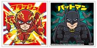 1980 年代にシールブームを巻き起こし、40 年以上経ったいまもなお人気を誇る「ビックリマン」のキャラクターデザインなどで知られるグリーンハウスの米澤稔、兵藤聡司がイラストを担当。赤いスーツを身にまとい超速で走る姿のフラッシュと、背後にコウモリを従え堂々とした風格のたたずまいで圧倒する伝説のバットマンが、かわいい2頭身キャラクターになっている。