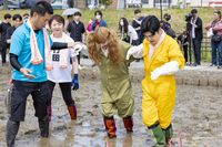 今回、続編公開を記念してコラボレーションを果たしたのは、ギネス世界記録にも認定されている世界最大の田んぼアート「行田市田んぼアート」。535名の市民が集まった会場に、田植えファッションで登場した加藤と益若。越谷市出身の益若は、行田のイメージについて訊かれると「一回通ったことあるかな…?」と呟きつつ「でもゼリーフライは食べたことがあって本当においしかったです!古墳も見ました!」と行田市民の前で必死にアピール。静岡県出身で行田市初上陸の加藤は、ゼリーフライに興味を示していた。