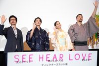 『私の頭の中の消しゴム』(04)のイ・ジェハン監督によるラブストーリー『SEE HEAR LOVE 見えなくても聞こえなくても愛してる』のディレクターズカット版劇場公開の初日舞台挨拶が7月7日に新宿バルト9で開催され、山下智久、新木優子、深水元基、イ・ジェハン監督が登壇。七夕にちなんでキャスト陣は涼やかな浴衣姿を披露し、短冊に願いをつづった。