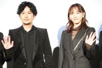 【写真を見る】稲垣吾郎は、キラキラと輝くブラックスーツ。新垣結衣はアシンメトリーのスカーフ柄スカートで登場