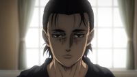 目指すは、進撃を続ける終尾の巨人のエレン。オニャンコポン(声:樋渡宏嗣)の見事な操縦で「獣の巨人」の投擲攻撃をかいくぐり、その巨大な骨の上に降り立ったミカサ、アルミン、ジャン、コニー、リヴァイ、そして鎧の巨人のライナーと車力の巨人であるピークの7名。ライナーがふと漏らした「エレンは俺たちに止めてもらいたいのかも」という言葉を希望に、アルミンは呟く。