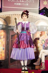 ウォンカの夢を邪魔する町の実力者でチョコレート組合の長、スラグワースの秘書ミス・ボンボンを演じた高橋は、パープルを基調としたカラフルなドレスで登場。映画の世界観にインスパイアされて作られた世界で1着だけの特別なドレスに身を包み、高橋は「袖にお菓子のモチーフがたくさん入っていて。チョコレートっぽくイメージされたドレープもすごくかわいい。『映画にエキストラとしてこの衣装で出ていました』と言ってもバレないかも(笑)。映画の世界観を体全身で表せているなと思います」と袖やスカートまでじっくりと目を通して、うれしそうな笑顔を見せた。司会から胸に飾られたネックレスは「実はチョコレート」だと伝えられると、高橋は「これですか!?」と目を丸くし、「いただきます」とパクリ。「おいしい」と頬を緩めていた。