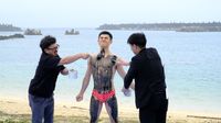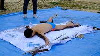 だが、全身に墨を塗る間に、天候が急変し、ザーザーと強い勢いで雨が降り始めた。「私のパワーが強すぎた!海の男になった!」と気合を入れ、アクアマンの“トライデント”を持つ小島が巨大な用紙に倒れ込み人間拓を完成させたものの、嵐のような雨と風で人間拓が吹き飛ばされてしまう事態に。しかし、小島の勇姿に、糸数町長や町民たちから盛大な拍手を送った。