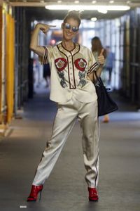 大きなサングラスに、髪をアップにまとめたセリーヌが着ていたのは、下着のようなブラ付きの、白に花柄のドレスと、オーガンジーの黒いレースの下着風ドレスの重ね着ファッション。裾にはフリフリのレースがついている上に、レースアップ風のヒールはかなり賑やかだ。