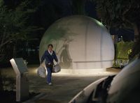 「ANDON TOILET」の名前の通り、時代劇でおなじみの行灯を思わせる四角い形。壁は乳白色の磨りガラスになっており、昼間は周囲の植物がシルエットを落とし、夜は和紙を通してろうそくの炎を灯したような淡い光を放つ幻想的な味わい。仕事中にタカシの幼なじみデラちゃん(吉田葵)が訪れるシーンに使われた。