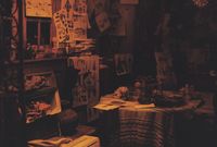 ハナの仕事部屋の奥にはもう一つ部屋がある。ウーパナンタを創造したアトリエだ。室内中に貼られているのは、ハナが描いたウーパナンタの人々やドラゴンなど生き物たち、生活用具から景観といった無数の設定画。そこには要点など、解説が書き込まれている。部屋の構造は天窓から光が射し込む屋根裏部屋で、壁を覆った本棚には小説を中心に様々な本が並び、備え付けの棚や床には漫画関連資料の段ボールが置かれている。
