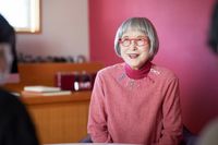 ドキュメンタリー映画で映しだされるのは、自分で選んだ“いちご色”の壁や本棚に囲まれた鎌倉のアトリエで、個性的なメガネをかけて創作に励む姿。自身の日常が映画になることに「なんだかとても照れる」と微笑んだ角野は、インタビュー当日も壁の色に合わせた“いちご色”の洋服に、首元にはメガネのピンをたくさん飾ったなんともキュートなコーディネート。「カラフルな洋服を着ると心が弾むんですよ。それに髪の毛が白くなると、いろいろな色の洋服が映えて、逆に何色でも着られるようになる。『白髪になって嫌だけれど、染めるのも面倒くさいな』と、ある日、染めるのをやめてみたんです。でもやめるだけではつまらないから『変わったことをやってみたい』と思って、派手な服を着てみたんですよ」と、なんでも楽しむことを大切に、日々を過ごしているという。