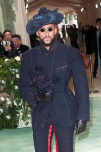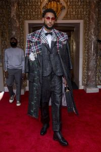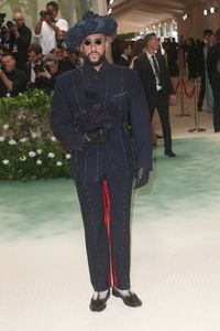 元カノのケンダル・ジェナーとの再会よりも、共同ホストとしてのファッションのほうへ話題をもっていくことに成功していたバッド・バニー。このルックが責務を果たせた理由は3つある。ブラックではなくネイビーでカスタムしたこと。裏地が見えていて、縫製の作業をひっくり返したような遊び心のあるメゾン・マルジェラを選んだことで、時間がさかのぼるバラードの小説「The Garden of Time」とドレスコードをクールに演出できたこと。そして、サングラス、ハット、花のブーケは、小説の主人公、アクセル伯爵をオマージュしながらも、いずれも独創的なデザインやカラーをピックアップしたことだ。マルジェラのタビシリーズのシューズがこれほどハマるスタイリングもないのでは?と思わせたことまで含めて完璧だった!