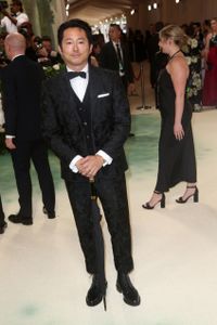 Netflixのリミテッド・シリーズ「BEEF/ビーフ」で脚光を浴びたスティーヴン・ユァンは、今年の賞レース一連の格好をみている限り、奇をてらわないがつまらないものにしないスタイリングが上手!シンプルなブラックタキシードコーデかと思いきや、セットアップにはフラワーなのかプラントなのかが繊細に刺繍されているし、ボトムスがアンクルレングスだから、それを活かすレースアップブーツを選んでいる。このトム・ブラウンならではのシルエットが彼に合っていて、傘の小道具も気が利いている。ひとつひとつも個性が強いアイテムたちをまとめているのが、潔くすべてゴールドで揃えたアクセサリー。だから傘も悪目立ちしないのね!セレブでなくても取り入れたい要素が満載!
