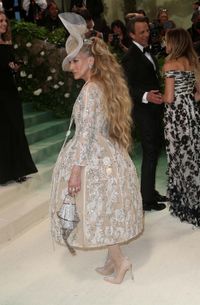 アラフィフのスター、ジェニファー・ロペスも、今年の共同ホストのうちのひとり。余裕もオーラもありまくる、見事なルックで来場した。ラインストーンとシルバーパールが散りばめられたシースルーのドレスは、ダニエル・ローズベリーによるスキャパレリのオートクチュール。ストラップレスのドレスは、胸元に彫刻のようなドラマティックなデザインが施されていて、ジェイ・ローの女神感を一層強くした。同じく胸元にはそのデザインに負けないダイナミックなダイヤモンドの鳥のネックレスが光り、自然への敬意を表している。ガウンに250万ものビーズを刺繍するのに、800時間を有したそう。今年のメットガラの正解のようなルック!