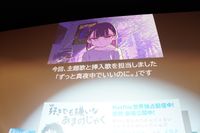 そんななかステージには、「ずっと真夜中でいいのに。」から登壇者にはサプライズでメッセージが到着した。メッセージでは、「柴山監督との話し合いでは、『繊細な方が行きつく場所』というワードが印象に残った」といい、「もともと自分が作っていた欠片とシンクロする部分が多くて、想いを並走して作れたことがすごくよかったです。ラフの映像を見ていて、最初の方に逃げたふたりがトンネルの下で話しているシーンがずっと印象的で。そこで『ツムギは学校に行くという習慣がなくて、知らないんだ』とはっとして。“当たり前に思っていても違う習慣があるふたり”というのも、曲作りのキーになっていました」と曲作りの過程を回想。