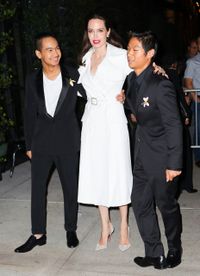 トロント映画祭出席で白いシルクのジバンシーのパンツスーツを着ていたアンジェリーナは、その後黒いラルフ&ルッソのドレスを着ていたが、ニューヨークプレミアではダークグレーのクリスチャン・ディオールのふんわりドレスを着て登場。子供たちだけではなく、疎遠だった父親のジョン・ヴォイトもレッドカーペットに華を添えた。