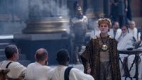 本作におけるカラカラ帝とゲタ帝は相乗効果で、クレイジーさを増していく。ゲタ帝役のジョセフ・クインとのテンション高めの共演(狂演?)も見どころだ。「僕にとって運が良かったのは、ジョセフと早い段階で顔合わせができたことです。世代が一緒なので会ってすぐに意気投合したし、彼は本当に“いいヤツ”です(笑)。カラカラとゲタには、どこかコンビ芸のような要素がありますから、そういう点では相性の良さが生きたと思います」歴史に詳しい方なら、共同統治のあとにカラカラ帝とゲタ帝が陰惨な決別をするのはご存知だろう。本作ではそれをアレンジして、より鮮烈なかたちで提示している。
