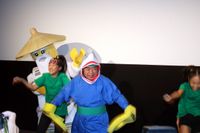 出川はニンジャの衣装と演じた“サメ将軍”を意識した被り物をつけ、ダンスキッズたちと華麗なステップを踏みながら登場。最初は3役だったが、急遽7役を演じることになった出川は「リアルな話をすると、アフレコが早く終わりすぎたので、次の取材まで2時間くらい余っちゃったから、時間つなぎで4役増えたんだと思います」と恨み節。