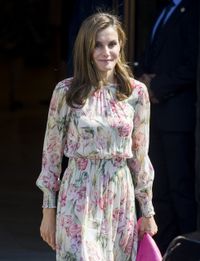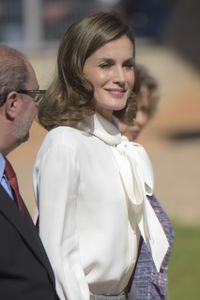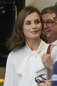 赤いカクテルドレスなど、格別な美しさを放っているレティシア王妃だが、この日は、流行りの胸元にリボンのある白いシャツに、グレーのチェックのパンツと黒いスウェードのパンプスというシンプルな出で立ちでオープンスクールのイベントに参加した。