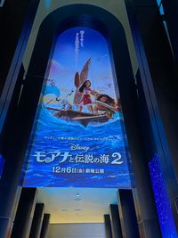 ”モアナ”シアターがあるTOHOシネマズ 六本木ヒルズを訪れてみると、5階のコリドーで最初に目に入るのが、天井に掲げられた本作の大きなポスタービジュアルだ。「待ってろよ!モアナ、マウイ!」と心のなかで挨拶をし、ゆっくりと足を進めていくと、壁面に星空が美しい夜空と光をたたえた海原が広がっていて、そこでいっきに心を鷲づかみにされる。そのどこまでも青い空間にも、モアナやマウイらの勇姿を拝むことができる。