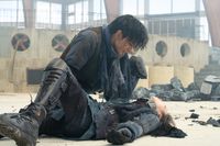 冒頭からSFアクション映画のようなシーンから始まり、ファンタジック・ラブストーリーのスタートとしては驚きの声も多く上がっている本作。これは、「蒼龍戦記」の戦闘シーンを描写したもので、今回解禁となった場面写真では、物陰に隠れ戦闘態勢をとるガロアスの姿や、瓦礫が散乱する荒れ果てた場所で武器を構え共に戦うガロアスとシャドウ、そして、ぐったりと倒れたシャドウのそばに駆け寄るガロアスの姿が切り取られている。