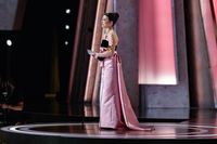 フォークの女神と呼ばれるジョーン・バエズ役で助演女優賞にノミネートされていたモニカ・バルバロは、ディオールのドレス姿で会場の視線を釘付けにした。トップは、ビーズ素材でデコルテを大胆に披露。淡いピンクのプリンセスラインのスカートも実に美しかった。