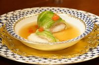 直太朗が作ったレシピの行方を充が探し求めるシーンでは、当時の味を知る人物が再現したレシピの一部も登場。「ロールキャベツの雑煮風」は、たっぷりと出汁を吸ったキャベツで牛ひき肉と柔らかなお餅を包んだ一品。華やかなフルコースにあっては異彩を放つが、直太朗が目標とした“日本と他国の料理の融合”を見事に体現した料理だ。いぶかしげに皿を眺めていた充が、スプーンを口に運んだ途端に目つきが変わる。天才料理人をうならせるその味…ぜひご相伴にあずかりたい。