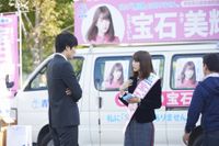 10月上旬、横浜市内のビルにて、美輝と俊也が選挙事務所の中で事態の急変に対応する重要なシーンの撮影が行われた。選挙事務所の看板、ポスターなどはもちろんの事、手前に停められた選挙カー、支援者のキャストが羽織る選挙ジャンパーに至るまで、ピンクを基調とした“宝石美輝”カラーで埋め尽くされており、あたりは噂を聞き付けた見物客が絶えない状態に。