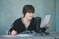 笑顔で「よろしくお願いいたします〜!」と元気よく挨拶し、放送室風にアレンジされた収録現場に到着した大橋。ディレクターからのコンセプト説明や収録時のリクエストを聞きながら台本に目を通し、アクセントなどを中心に気になるワードやその意味について丁寧に確認。台本にはなにわ男子の大橋和也として、途中からは劇中の国民的アイドル、桐ヶ谷皇太として言葉を伝えるパートがあるため、大橋バージョンと桐ヶ谷バージョンのアクセントで実際にセリフをしゃべりながら、「このアクセントはどっちですか?語尾は上がります?下がります?」など細かく確認していく。ひととおりの確認を終えると、しばらく1人で時折真剣な表情を見せながら、台本を読み込む。「よきタイミングで収録を始めます」とディレクターからの声がかかると「いつでも大丈夫です!」と準備万端といった様子で大橋が返事。いよいよ収録がスタート!の直前で、おなじみのフレーズ「プリン食べすぎてお尻プリンプリン!の大橋和也です。好きなものはプリンです!」と声出しをしてから収録に挑んだ。