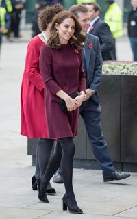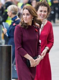 11月8日、ロンドン市内で行われた子どものメンタルヘルスを考える団体Place2Beのフォーラムに出席したキャサリン妃は、バーガンディ色のゆったりとしたミニ丈のワンピースを着て現れた。秋らしい色のワンピースはゴートのもので、値段は480ポンド(約7万円)。お腹の膨らみをカバーするデザインは、妊婦たちの必須アイテムと言える。サイドから写された写真を見ると、キャサリン妃のお腹もようやくぽっこりと大きくなってきたようだ。
