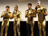 金爆、黄金全身タイツで人文字に挑戦!“人間鯉のぼり”の樽美酒はあえなく落下