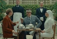 美術や装飾だけでなく、画角や構図にも独自のこだわりが。オープニングクレジットでは事故後のザ・ザがバスタブでくつろいでいる姿が映しだされ、その周りで使用人たちがせわしなく働いている。この一連は真上から長回しで撮影されており、何気ない日常のシーンにもかかわらず、緻密に計算された俳優たちの動きを俯瞰で眺めているうちに気づけばどんどん画面に引き込まれてしまう。