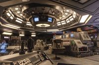 続いて、マジノ号のコントロール・ルームを経て、プロディジー社内のセットを見て回る。マジノ号は70年代風のレトロフューチャーな内装で、スクリーンはすべてCRT(=ブラウン管)で画角は4:3。『エイリアン』(79)の世界観を完全に再現している。これに対して、プロディジー社はコンクリートの壁にモノトーンの棚や机が並んでいてクールな印象。スクリーン類はすべてフラットな液晶タイプで、アスペクト比は16:9になっている。プロディジー社はここ10年ほどで台頭した新興企業という設定なので、ユタニ社と違って、やや近代的な意匠なのだ。こういった美術の差異に着目してみると、作品のおもしろ味がさらに増す。