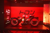 会場の1Fには一度は乗ってみたい劇中に登場するライトサイクルのライド体験ができるスポットがどーんと真ん中に鎮座。膝をついて乗る形になるため、必要に応じて踏み台を用意してくれるのもうれしいポイント。搭乗時間は約30秒程度。渋谷の街がデジタル世界に侵食されているなかをライトサイクルで走り抜ける感覚を味わえる。こちらの体験のおすすめポイントは、ライド中の映像がゲットできること。ライド終了後には二次元バーコードの記載されたシートが手渡される。映像を観ると、映画の世界観に入り込んだ感覚を何度でも味わうことができるので、来場の記念にダウンロードを忘れずに。ライトサイクルの左手には、アレスが使用するディスクが展示されている。これまで主流だった円形のディスクから、角ばったフォルムに変化しているのもポイントだ。