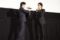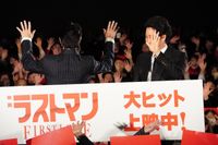 この日、2人は「ラストマン」スペシャルラッピングカーに乗って新宿ピカデリーまで駆けつけた。上映後の会場は、感動と熱気でいっぱい。福山と大泉が姿を現すと「ましゃー!」「洋ちゃーん!」と大歓声が沸き起こり、2人は鳴り止まぬ拍手に手を振って応えた。