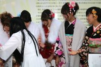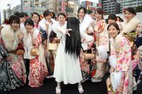 貞子からのプレゼントは『ザ・リング/リバース』のペア鑑賞チケット3セット分。貞子が自ら抽選箱をぶんどり、ハガキを引こうとしたため、新成人たちは爆笑!さらに貞子は引き終わった後、ハガキを会場にばらまくという暴挙に出た。
