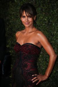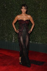 ハル・ベリー着用のドレスは、マドンナやビヨンセなど、多くのセレブが愛用するデザイナーズブランド「Reem Acra」のもの。ハルが選んだのは、ボルドーレッドに黒のレーシーな装飾が施されたドレスで、上半身はベアトップのビスチェ風。ハルはおくれ毛を遊ばせたラフなアップヘアで、滑らかな背中を大胆に見せている。