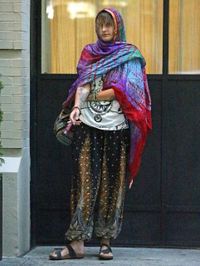 数年前からヒッピー的なライフスタイルにどっぷり浸かっているパリスは、パパラッチされた時も自由人らしいいで立ちだった。ざっくりしたメッシュ素材のムラ染めセーターを片側だけ肩を出して着用し、下にはカラフルな絞り染めのパンツを履いていた。パンツは下着と見間違えるほどの小ささで、お尻がはみ出てしまっている。バッグやアクセサリーなどの小物もエスニック系で統一していて、全身ヒッピーテイスト満載のスタイルだ。