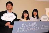 『あの日見た花の名前を僕達はまだ知らない。』や『心が叫びたがってるんだ。』で知られる人気脚本家の岡田麿里が監督に初挑戦した劇場版アニメ『さよならの朝に約束の花をかざろう』(2月24日公開)の完成披露イベントが2月13日に新宿バルト9で開催され、声優の石見舞菜香、監督・脚本の岡田、プロデューサーで制作を手がけたP.A.WORKS社長の堀川憲司が登壇した。