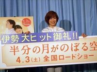 三重県伊勢市でロケをした、『砂時計』(08)の演技派俳優・池松壮亮&ポッキー少女・忽那汐里共演のラブストーリー『半分の月がのぼる空』(4月3日公開)が伊勢市で先行公開され、大ヒットスタートを切った。3月31日、角川映画試写室で大ヒット御礼会見が行われ、三重県出身で「みえの国観光大使」を務める磯野貴理が登壇した。