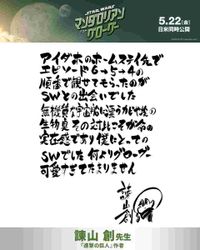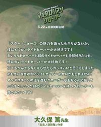 「東京卍リベンジャーズ」作者の和久井健は、「スター・ウォーズ最新作!!!オビ=ワンとルークに魅せられて、オビ=ワンとアナキンで泣いて、ヨーダとルークで胸が熱くなる。そしてマンダロリアンとグローグー!!!師弟関係はスター・ウォーズの王道!!」と熱い言葉でシリーズの魅力と映画への熱い思いを寄せた。