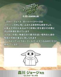 日本だけでなく世界中の読者を熱狂させてきた人気漫画家たちが、「スター・ウォーズ」への深い愛と情熱を持ったコメントを寄せている。「はじめの一歩」の作者である森川ジョージはキュートなグローグーを書き下ろしたイラストとともに、「『スター・ウォーズ』のハイパースペースはスクリーンの中に吸い込まれる衝撃的な感覚でした。以来必ずなにかがあるはずと劇場に足を運びその度に沢山の刺激を受けています」と、「スター・ウォーズ」最新作は必ず映画館で鑑賞していることを明かし、「銀河の遠い場所の人たちの物語が何故か身近に感じられます。マンダロリアンとグローグーもきっとそうなるのだろうと期待しています」と本作への期待を寄せた。