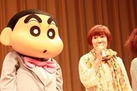 人気アニメ映画18作目『クレヨンしんちゃん 超時空!嵐を呼ぶオラの花嫁』(4月17日公開)の完成披露試写会が4月11日に虎ノ門のニッショーホールで開催され、しんちゃんこと野原しんのすけファミリーの着ぐるみたちや、しんのすけ役の矢島晶子ら声優陣が登壇。また、mihimaru GTが主題歌「オメデトウ」を熱唱し、しんちゃんたちといっしょに舞台挨拶を行なった。
