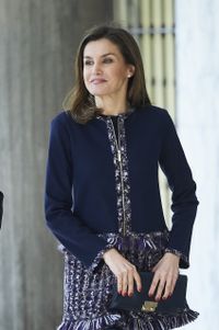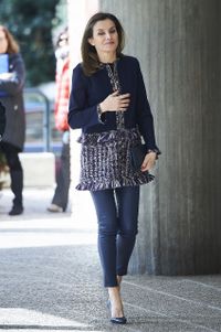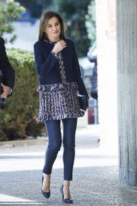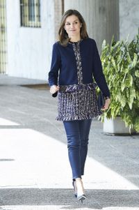この日のレティシア王妃は、レギンスと見間違えるほど細身な濃紺のレザーパンツに、同色のハイヒールを着用。シャープなレザーパンツでもカジュアルにせず、フリンジがたっぷり施された豪華なツイードジャケットを合わせて、フェミニンに仕上げていた。