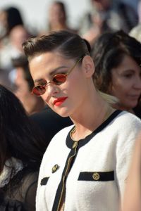 シャネルの広告塔を務めているクリステンは、トレンドのまとめ髪にエッジのきいたさまざまなファッションで映画祭を席巻しているが、とりわけヴァニティ・フェア誌のディナーパーティで着ていた、シルバーのスパークリングのツーピースジャケットに、脚が透けて見えるアクリル素材のブーツという出で立ちは、ミニスカートから覗くスレンダーな脚も、ブルーのスモーキーなアイメイクも好評。