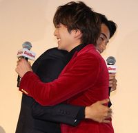 現場では顔を合わせるたびにグータッチをして親交を深めていたそうで、東出は「寝る前もやったもんね」とニッコリ。新田も「やってたやってた!」と笑顔を弾けさせ、「おやすみって言ってグータッチして寝ていた」と続けると、会場に駆けつけたファンのためにステージ上でグータッチを生披露することに。久々のグータッチとあって、クールに決めるはずが一度目は失敗。二度目は見事に成功して東出と新田がうれしそうに抱き合った。
