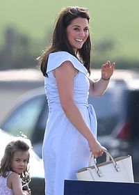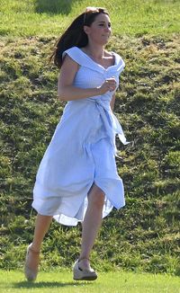 キャサリン妃が選んだのは、先日のホートンホース・トライアル・イベントと同様にザラのドレスとラッセルアンドブロムリーのウェッジサンダルという出で立ち。69.9ドル(約7000円)の水色と白のストライプと、デザインは違うもののオフショルダーのドレスを肩を露出せずに着こなしているのは前回と同じ。