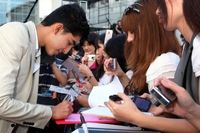 『エアベンダー』(7月17日公開)の日本公開を記念した、3Dパワープレミアイベントが7月6日に行われた。今日の目玉は史上初の1000人同時屋外3Dオープニングイベント。劇中に登場する4つのエレメント“氣・水・土・火”を3Dで体験し、演出として体で体感してもらおうというもの。およそ1000人の観客に3Dメガネが手渡された後、M.ナイト・シャマラン監督、デヴ・パテル、ジャクソン・ラスボーン、ニコラ・ペルツがレッドカーペットに姿を現すと、大きな拍手と熱い声援が四方から送られた。シャマラン監督たちはサインや記念撮影に気さくに応え、サービス精神旺盛!