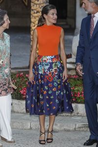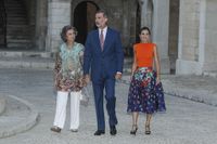 義母ソフィア、夫のフェリペ6世国王とパルマ・デ・マヨルカの宮殿のレセプションに参加したレティシア王妃は、数日間の地味目な超カジュアルルックとは打って変わって、非常に華やか。